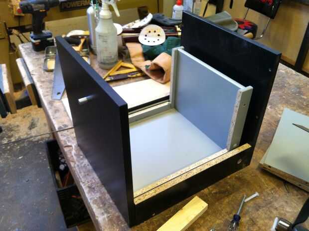 Luego vuelve a montar la pieza entera con el panel frontal del cajón a instalar. Es claro, una vez que lo pongo juntos otra vez que el frente del cajón era bastante endeble, por lo que reforzó el frente por epoxying dos soportes en L a las caras de frente y fondo en el interior.