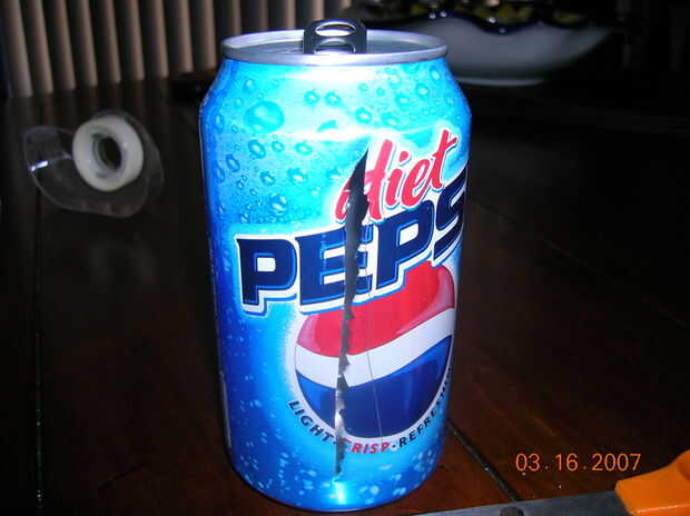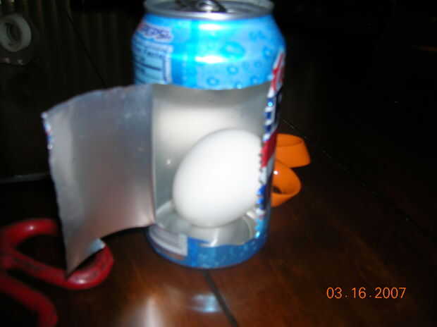 Uso el cuchillo para cortar una línea lanzó el frente de la can. Corte a la izquierda o derecha para hacer la puerta. Asegúrese de que el huevo quede pulg. su cuerpo es nnow listo a caer!!