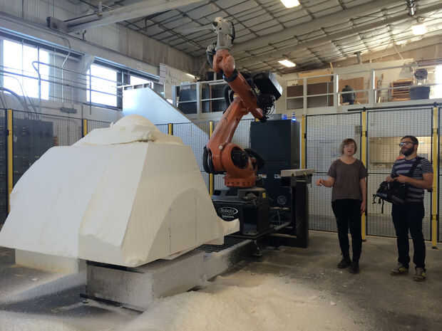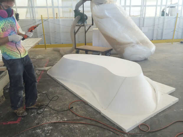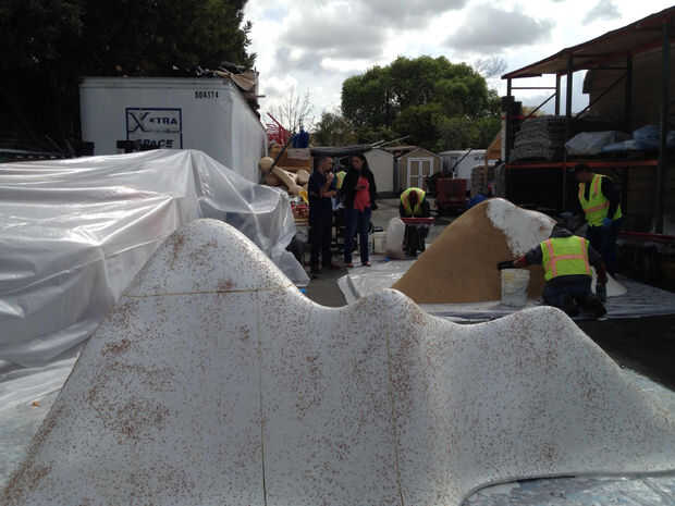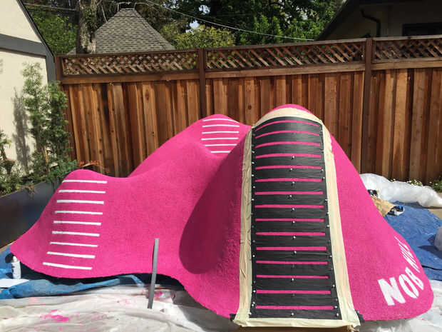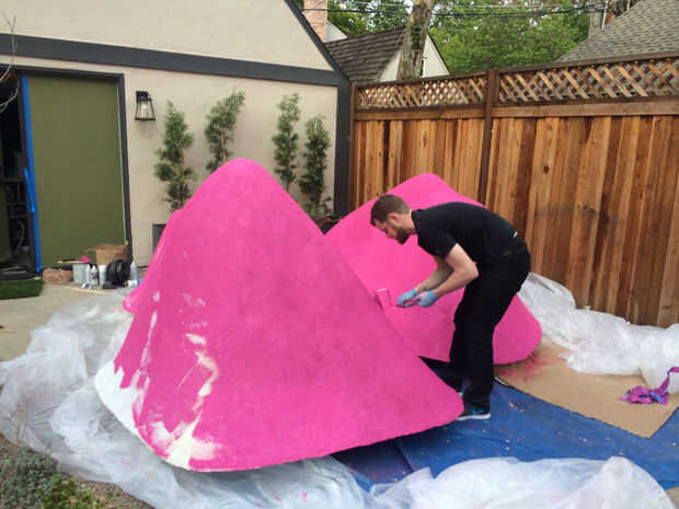 Una vez que los montículos fueron molidos y surgieron, fueron enviados a nuestras instalaciones para ser pintado. Allí se utilizó una pintura exterior para aplicar el color rosa y una graffiti grado cáscara de huevo blanco pintura de aerosol, con plantillas, para las anotaciones.