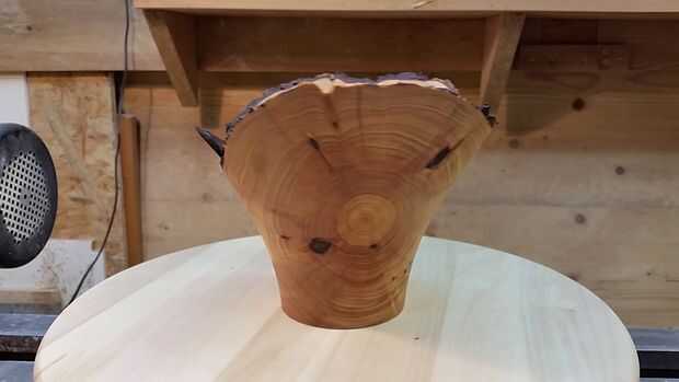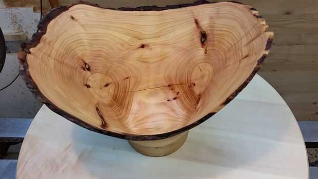 Este tazón de fuente se hace girando una pieza entera de registro por su parte, y esto presenta a la woodturner con muchos obstáculos a superar, a partir de la fijación del registro para el torno y terminando con el hecho de que el tazón de fuente presentará dos nudos grandes (que son el centro del tronco, una parte de la madera que tratamos de evitar sobre todo en madera para su tendencia a agrietarse mientras se seca) , con algunas sorpresas más entre aquellos.