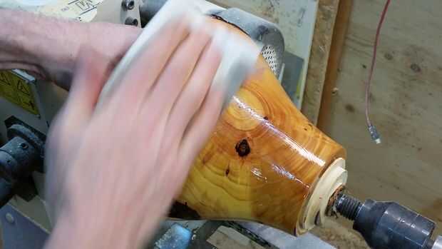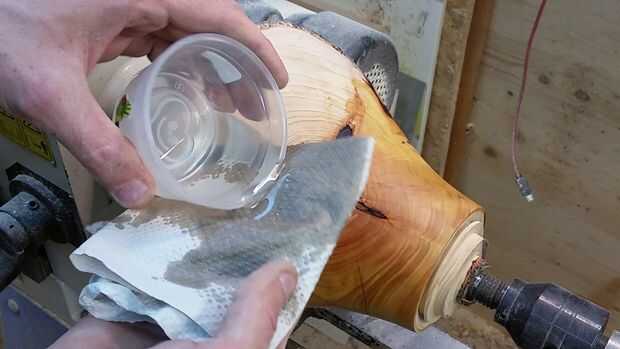 Después de que el exterior de nuestro tazón de fuente es lijar a 400 (para proyecto que me voy con un borde natural y un acabado mate de aceite que va de la arena hasta 400, no más), puedo comenzar aplicando mi elección de acabado, en este caso, aceite mineral. Ahora, el aceite utiliza voluntad hacer algunas cosas diferentes. Acondiciona la madera, ralentizando el proceso de secado, que es bueno, puesto que significa que hay una buena probabilidad de los nudos que son el centro del registro no se agrietarán y nudos tienden a hacer cuando se secan. Desplazará el agua en las células de la madera, lo que es más estable, y le dará a la madera un color más fuerte y hará que el grano "pop" hacia fuera.