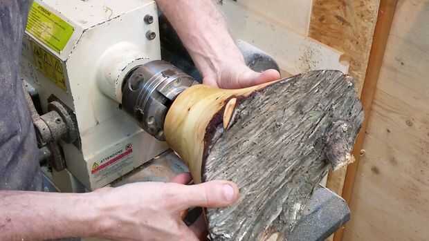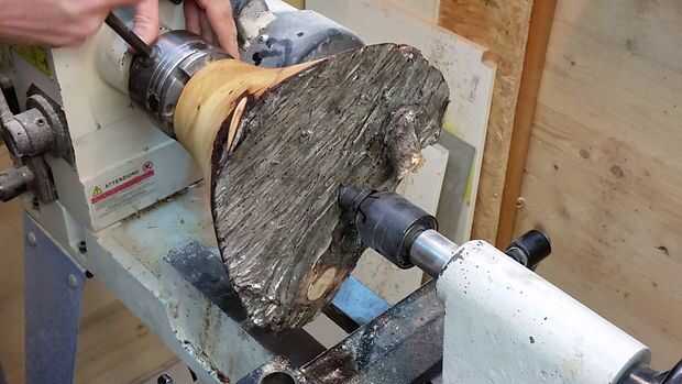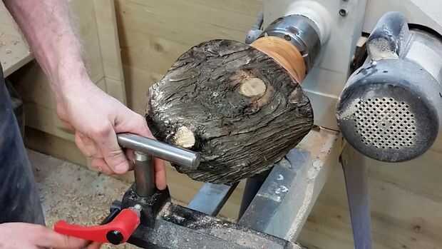 Una vez hecho el exterior del recipiente, podemos reemplazar el centro de la unidad con nuestra tirada y montar el recipiente a él utilizando la espiga que hemos creado antes. Como se puede ver en la segunda imagen, estoy utilizando mi contrapunto para apoyo y darle a la madera misma presión mientras que apriete las mordazas del portabrocas, después de lo cual elimino el contrapunto, en preparación para el vaciamiento del recipiente. Traer su descanso de la herramienta hasta la cara de la taza, pero, si usted tiene cualquiera de las ramificaciones (como obra), asegúrese de que no llegan el resto de la herramienta, o el banjo, mientras hace girar.