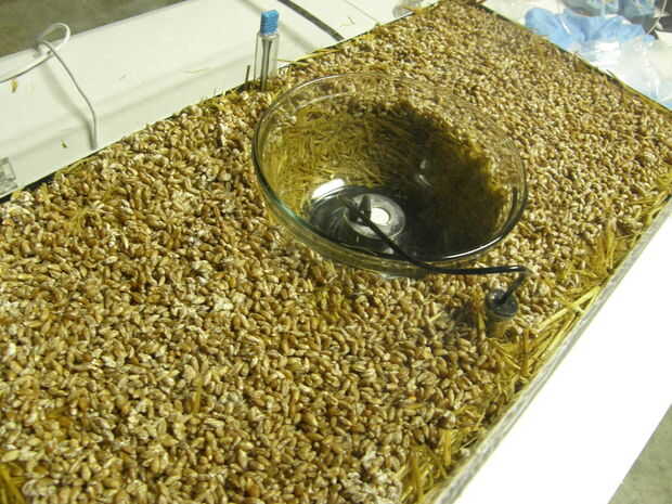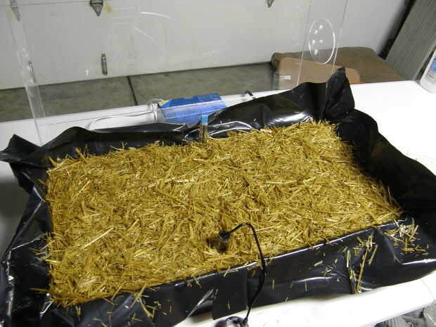 Cuidadosamente llena la caja con el heno estéril, presionar ligeramente pero no embalarlo. Asegúrese de enterrar el sensor de temperatura sobre a medio camino en el heno. Sacar un espacio en el centro lo suficientemente grande para el recipiente.