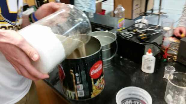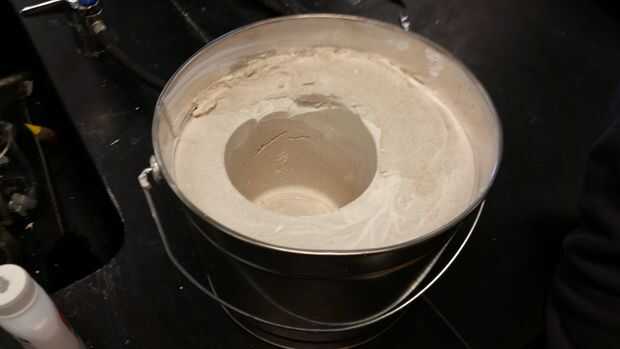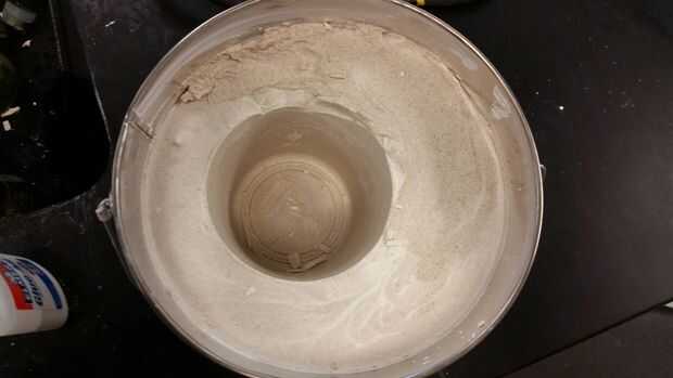 Mezclar agua, arena y yeso de París en un 7: ratioand 7:5 revuelva hasta que los trozos se han ido. Vierta la mezcla de yeso en el cubo de acero, poner el cubo de plástico pequeño en el centro y empuje hacia abajo. Si desea puede hacer una tapa con otro cubo y llenado parcialmente con yeso y colocar pernos en u en ella para el agarre. Deje que el yeso seque durante alrededor de una hora.