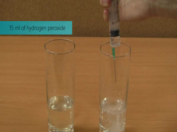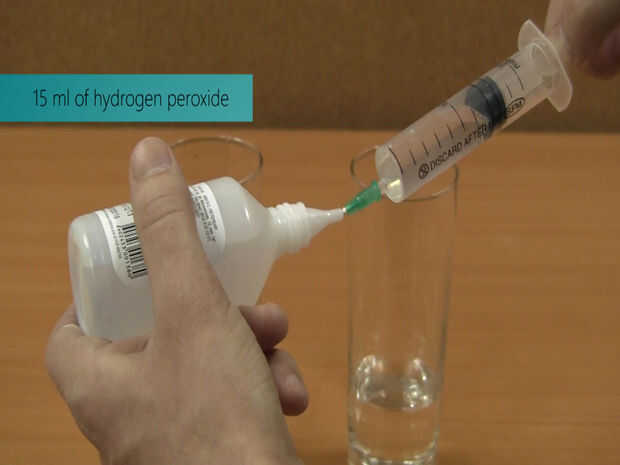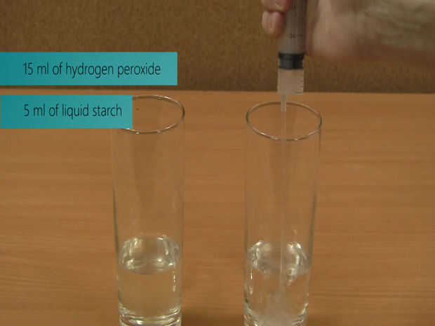 En un segundo vaso mezclar 15 ml de peróxido de hidrógeno y 5 ml de almidón líquido.