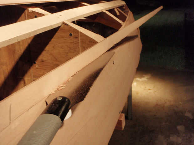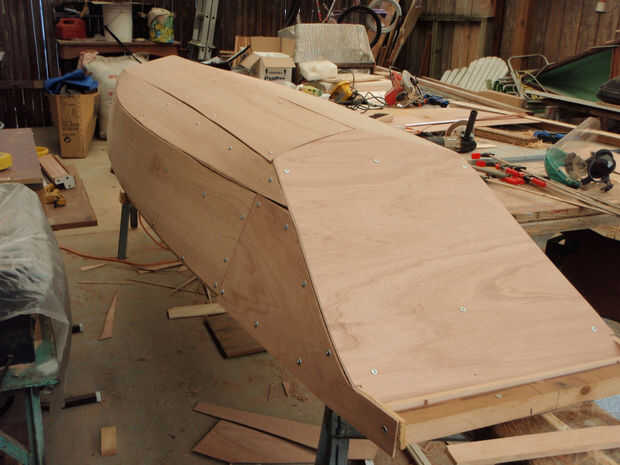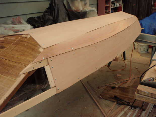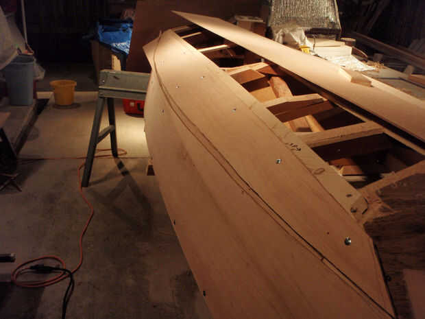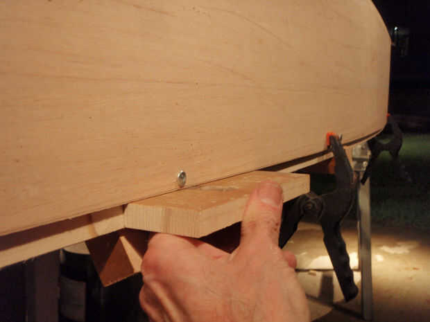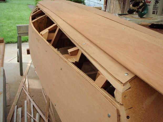 Se utilizaron tornillos de cabeza de arandela para minimizar el daño a la madera contrachapada. Los primeros paneles fueron espaciados un ½" por encima del borde para que cuando el outwale se sujeta el borde de la madera contrachapada ser forrado.