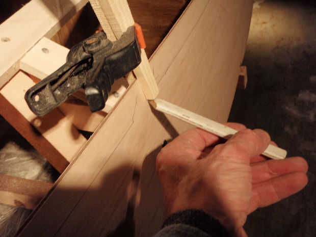 Una herramienta de marcado simple consistió en dos trozos atornilladas y el desecho del exterior era más corto por el grosor de un lápiz. En la tercera imagen se puede ver cómo el desecho interno fue colocado en el interior larguero. El lápiz marcó donde cortar el panel para proteger los largueros de la forma.