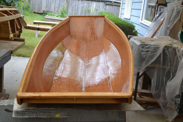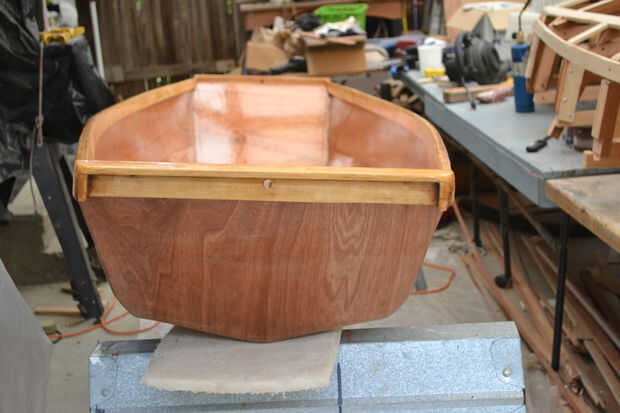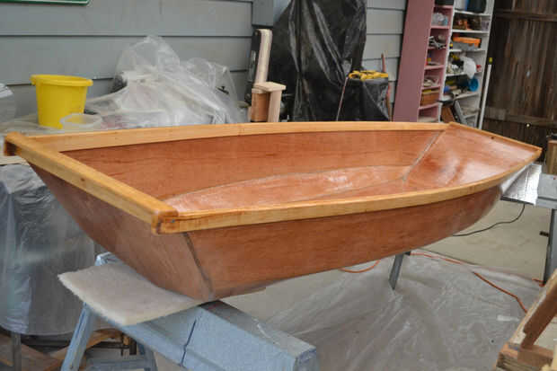 un velero construido con madera contrachapada de luan, de fibra de vidrio, epoxy y caoba un poco. Sobre todo de madera contrachapada aunque. Es una canoa outrigger modelada aproximadamente después de una proa, pero con un estilo en forma de casco más