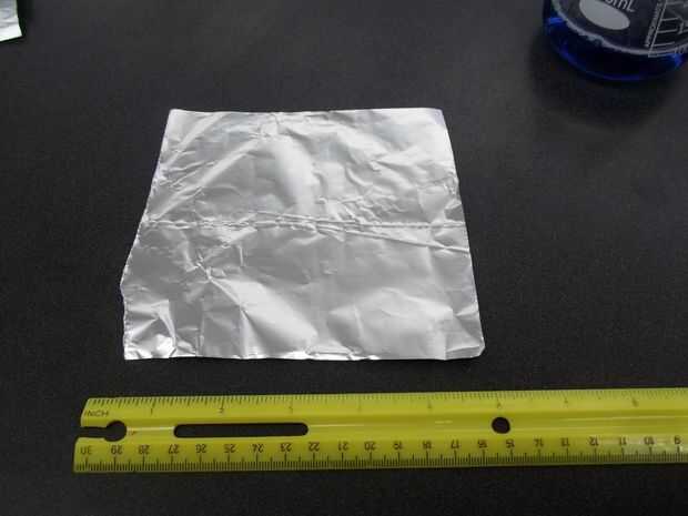 Tercero: Mida y corte 6 pulgadas por 6 pulgadas cuadrado de papel de aluminio. (Si utilizas más de 6 x 6, corre el riesgo del globo estallar y rocía gotas de cloruro de aluminio acuoso muy caliente sobre todo dentro de un radio de 10 pies :()