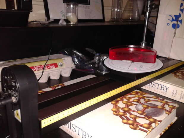 un experimento de clase óptica muestra la dificultad de encontrar la refracción de un osito de goma.Para realizar este experimento, necesitarás:-Un banco de óptica-Una mesa de rayos y la base-Una fuente de luz (hemos utilizado un láser)-Gummy BearsEl