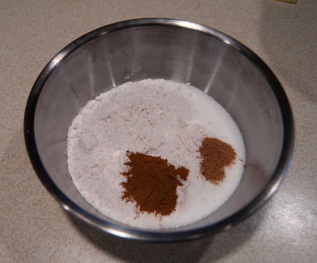 3) en un recipiente aparte mezclar harina, azúcar, canela y nuez moscada.
