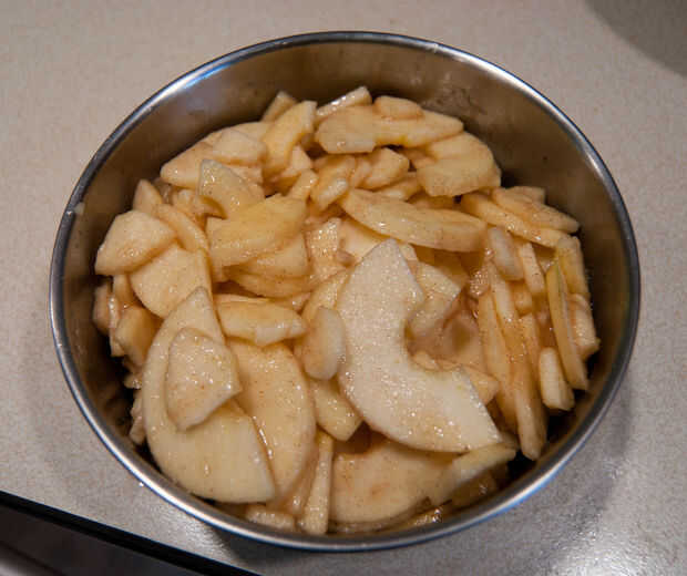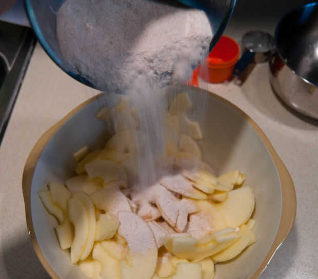 4) vierte la mezcla de ingredientes secos sobre las manzanas y mezcle a capa rodajas de manzana.