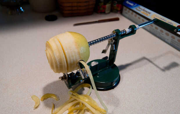 Foto Nota: Soy adicto a las tartas de manzana, son por lejos mi favorito, y tengo un artilugio que he incluido en un cuadro que hace cortar y pelar las manzanas increíblemente fácil. Es verdaderamente impresionante. Si te encuentras necesitando uno solo busca un "pelador descorazonador". Puedo pelar y cortar una bolsa grande de manzanas en menos de cinco minutos.