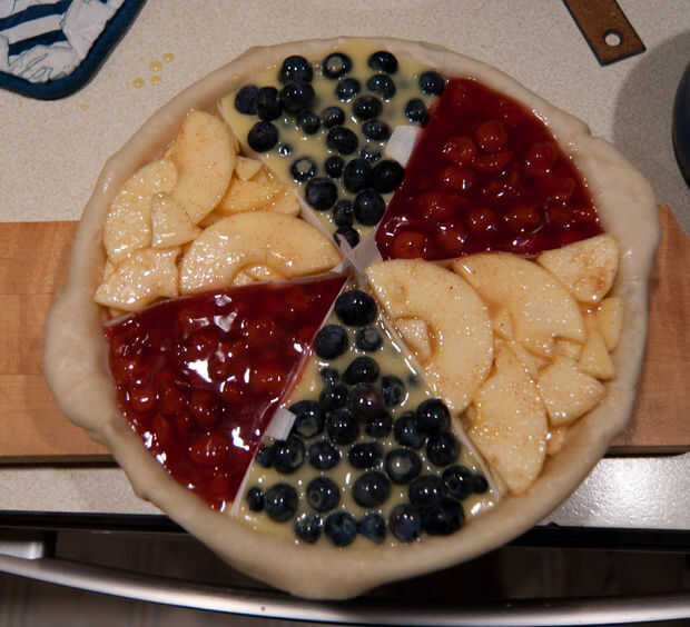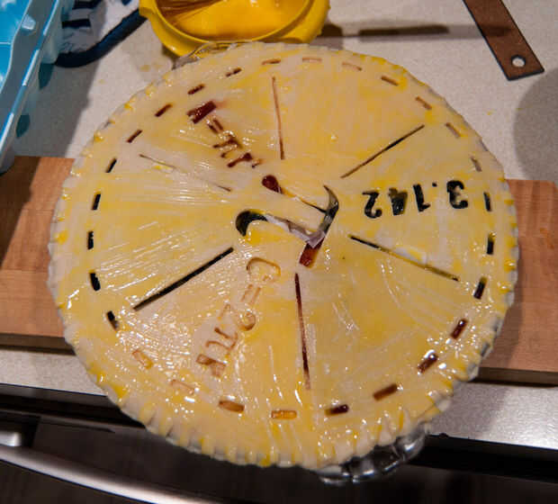 Para la corteza superior congeló después de cortar el patrón por lo que fácilmente podría recogerlo y coloque las líneas sobre las divisiones en la tarta. Sólo tomó unos minutos para que el borde para que por lo que yo podía engarzar la tarta. Después que había prensado el pastel usé un cepillo de cocina para pintar sobre las yemas de huevo batido para conseguir esa corteza marrón dorada brillante.