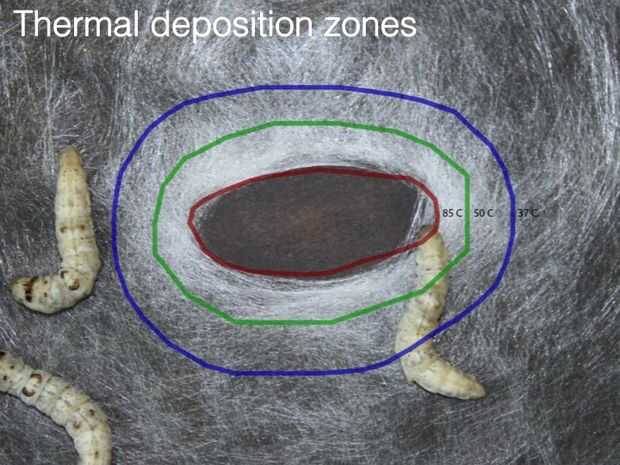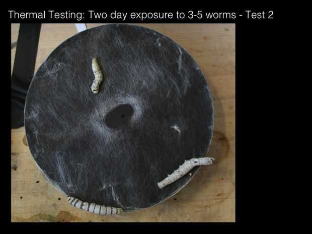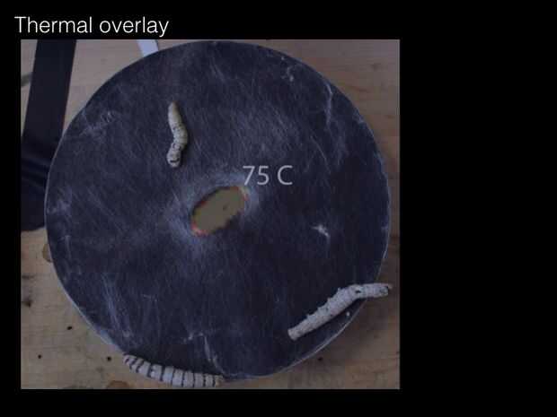 Los gusanos depositan seda en mayor densidad cerca de regiones cercanas a la fuente de calor - pero no demasiado cerca. El calor parecía crear a una especie de "fogata-efecto" que llamó gusanos a regiones. La superficie de estas regiones - según el FLIR - era alrededor de 40-80 C. El experimento fue repetido dos veces. No se controló la temperatura ambiente. Mi intuición es que si la habitación estaba muy caliente (quizás 28-32C o 80 a 90F), entonces este efecto desaparecería.