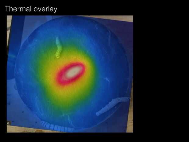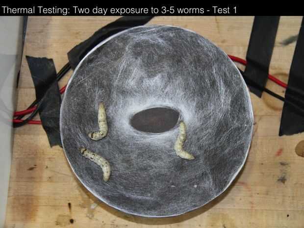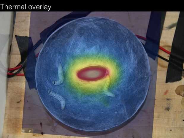 Para el experimento real, coloqué 3-5 gusanos de spinning en la superficie durante dos días. Tomé la temperatura de la placa con una cámara FLIR. Como puede verse en las imágenes térmicas, el calor es oval-como debido a la forma rectangular de la resistor de la energía. El gradiente de temperatura entre un núcleo caliente (alrededor de 140C) a temperatura ambiente.