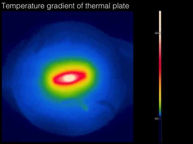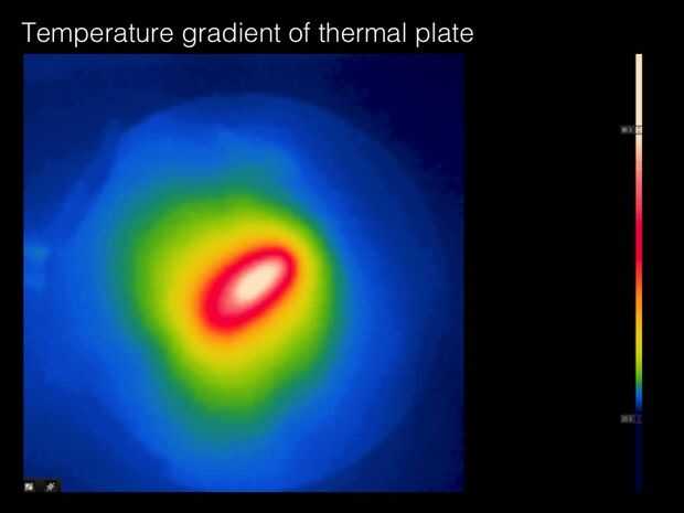 Para probar esto, hackeado una plataforma simple (fotografiada arriba) para crear un gradiente de temperatura. La plataforma fue hecha de vidrio de cal sodada cubierto con papel. Cristal fue seleccionado porque es un aislante suave. Un aislador fuerte, como silicona y muchos plásticos, crearía un gradiente muy fuerte. Si la plataforma se hicieron de un conductor térmico, como el aluminio u otros metales, toda la plataforma es la misma temperatura. Otros materiales con conductividad térmica similar deberían funcionar así.