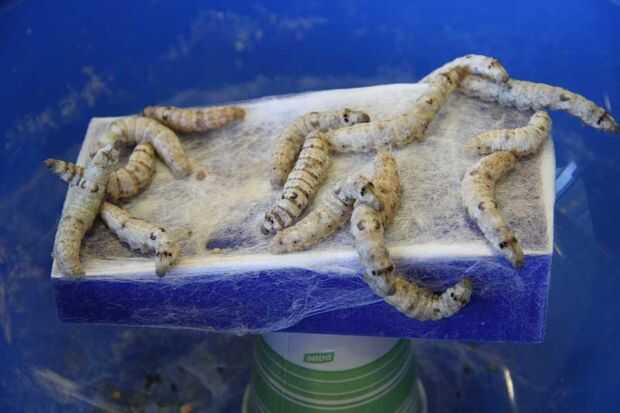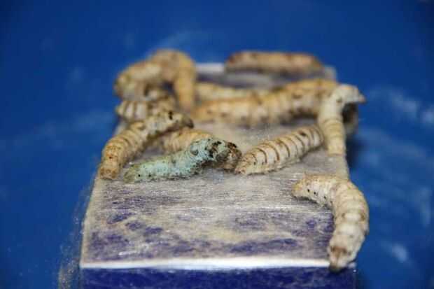 He dejado los gusanos en la onda de la cera para alrededor de 2 días y medio. Los gusanos aplican seda más a los bordes del bloque de cera.