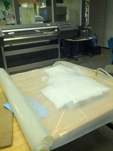 Apliqué una cantidad muy pequeña de resina encima de la bandeja de fibra de seda. (Aproximadamente 10-20 gotas) y suavemente alrededor de alisado para un recubrimiento uniforme. [Entropía resina Super Sap 100 funciona bien] Luego poner la cera, las fibras y la resina en una bolsa de vacío, había cubierto con el acolchado de algodón y aspirar la pieza durante la noche.