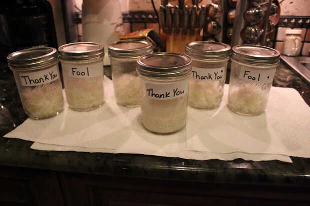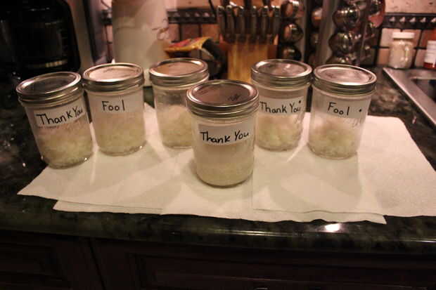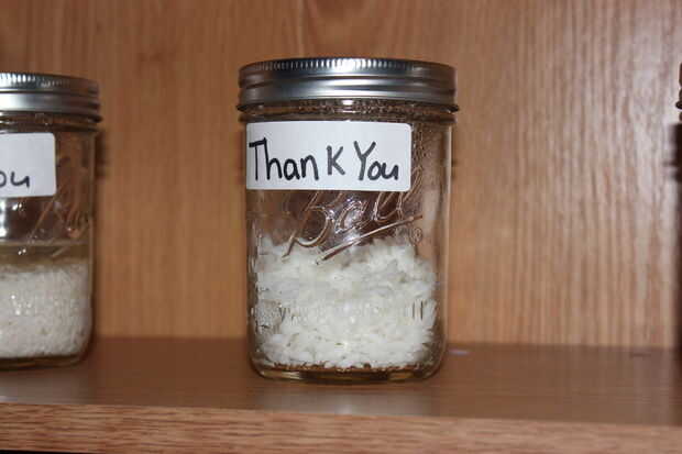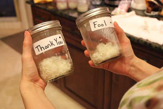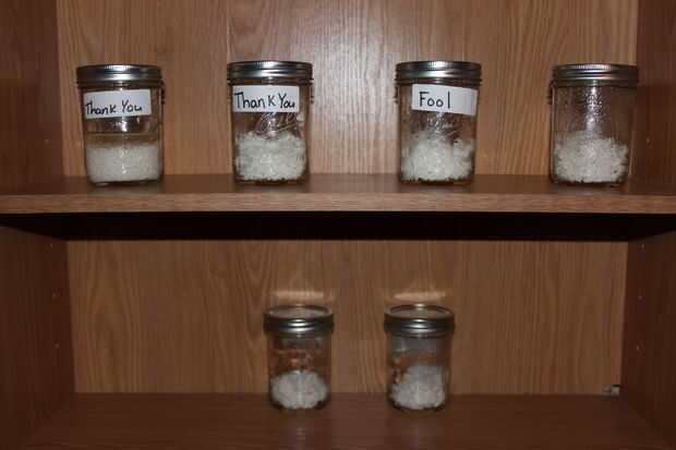 TAMBIÉN, porque soy una NERD ciencia... quería probar si las etiquetas solo podría cambiar la estructura molecular del arroz. Por lo tanto, hice 2 extra masón tarros con las etiquetas de "Tonto" y "Gracias". Estos arroz estará en un estante diferente y no voy a decir nada que estos tarros de Mason. Quiero probar para ver si puede haber alguna diferencia con lo que las etiquetas solo pueden hacer. también conocido como pueden influir en la estructura molecular positivo y negativo de la escritura ?? (mi hipótesis sobre esta prueba es No, no hará un cambio heeeeeeck no jajaja) pero quería probarlo!!!! He marcado estas jarras con un punto para no recibir en el futuro les mezclan con cualquiera de los otros. Estos frascos de "otros" también pueden ser conocidos como las Variables independientes, pero para un experimento diferentes en las pruebas si las etiquetas solo pueden cambiar la estructura molecular.