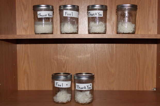 Para mi primer experimento. He utilizado 3 tarros de masón y les etiqueta como sigue: tonto, graciasy ninguna etiqueta. Según el Sr. Emoto, el arroz de "tonto" se da vuelta a negro, el arroz ignorado estará podrido y el "arroz de gracias" se fermenta. Estos tarros están todos en un estante en una sala recibiendo luz igual. Todos los días durante 30 días, le diré las tinajas emocionalmente lo que dice cada etiqueta. Estos diferentes tarros de Mason son también conocidos en la ciencia como las Variables independientes; o las diferentes variables utilizadas para probar mi hipótesis.