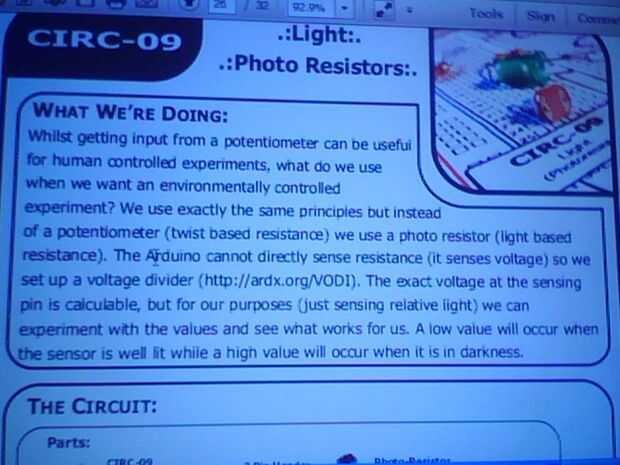 (Foto RESISTOR SETUP) Algunos además fácil de configurar, conectar su LED en el pin correcto indicado en la codificación que sigue dentro de poco, las necesidades foto resistor que se atarán en un resistor también ver fotos y se mide por un pin analógico 0 a menos que establezca como otro pin, el pin será leer la señal de resistencia y traducir a voltios el LED con eficacia la decoloración con los cambios en la luz , estaba en una habitación bastante brillante así que tuvo que utilizar extrema proximidad también había una grieta en la fotorresistencia que su función más todavía sin embargo trabajado lo suficiente para demostrar y me enseñe cómo funcionaba así como la codificación necesaria para controlar y medir la intensidad de luz entrante...