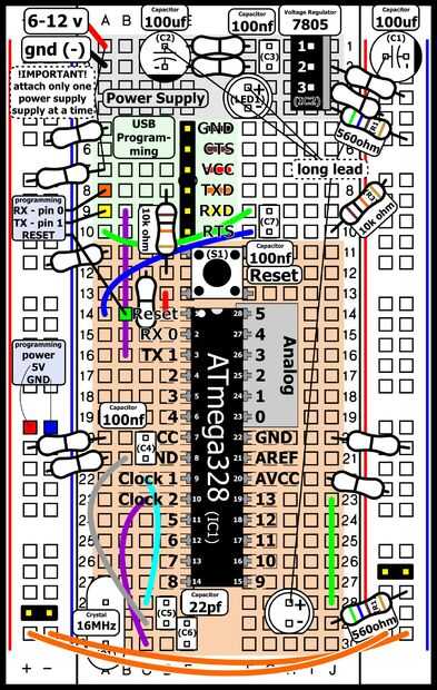 Su propio Arduino con todos los componentes más necesitan, puede ser reciclados para reducir los costos, para soldar a una sección de pref-junta con un montón de piezas de repuesto es posible hacer tu propio Arduino con una única configuración de pin o de habilidad o módulos de que se acople a su propio diseño de arduino, arduino básico es fácil y requiere pocos , reunir todas las piezas que necesita para hacer, sin soldadura breadboard, chip Atmega328 microcontrolador de múltiples colores de LED, Jumper cables mucho, k 16 mhz oscilador, condensadores de 22pf para el cristal de la sincronización, regulador de 5 voltios, Pin entradas, impresión de arriba o en línea, la selección de resistencias 560 ohm de diferentes calificaciones & 10 k ohmios, 100uf condensadores x2, un par de condensadores de 22nf y un tacto pulsador... todo puede reciclarse aparte el chip ATmega a menos que seas muy afortunado en barrido, hacer la fuente de alimentación, chip y sincronización con el cristal, condensadores para alisar tiempos y voltajes, resetbutton para el chip y resistencias en cada luz del LED...