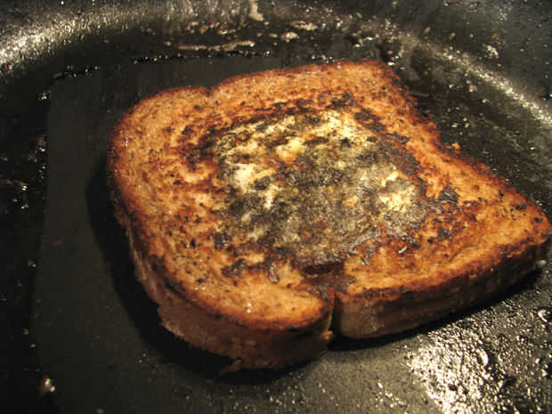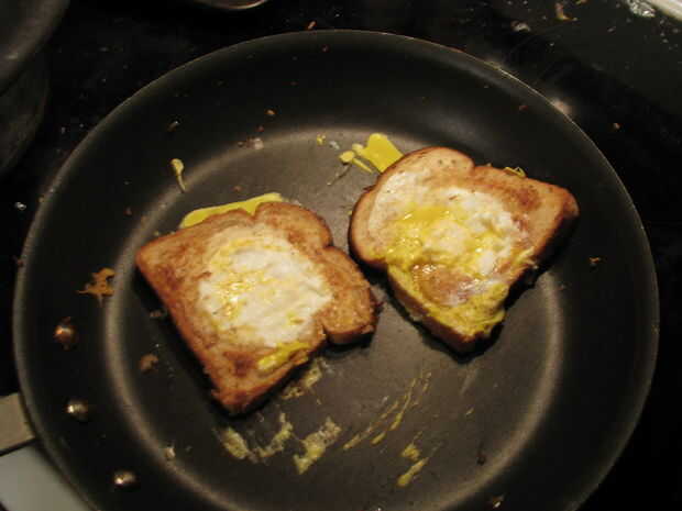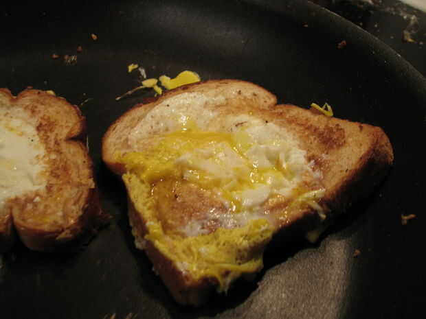Ahora que el huevo esté cocido lo suficiente como para aguantar sus el propios, su tiempo para tostar! Mueva la mezcla hasta lograr tostar el pan por ambos lados. Ahora su casi hecho!