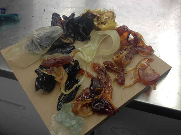Pongo algunas de estas formas en piezas posteriores con resultados interesantes. Las piezas muy quemadas (que parecen casi de alquitrán negro en las imágenes) aguantaron el calor y conservan su forma, pero las formas claro sólo cedieron y fundían en la fundición más grande. Sin embargo, esto puede ser una manera interesante de trabajar con el color (rojo intenso remolinos de una forma clara fundición, por ejemplo).