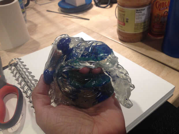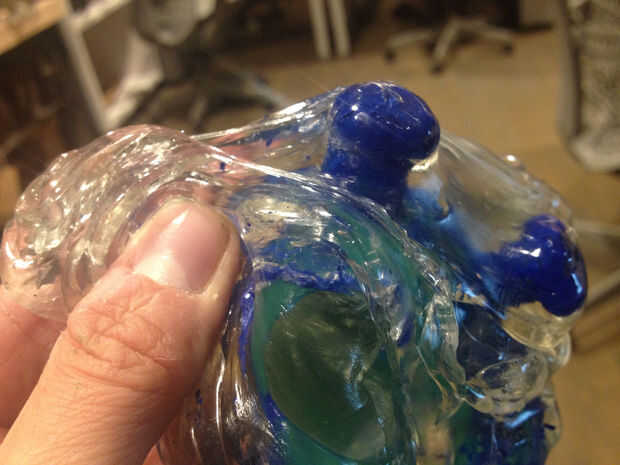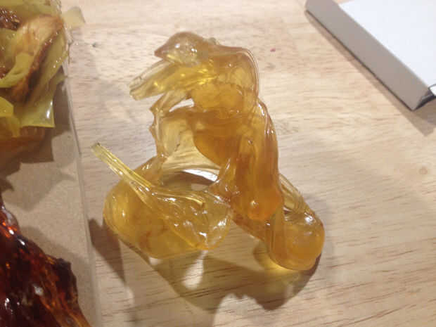 Al principio intenté verter el caramelo sobre una superficie engrasada y luego suavemente levantando como refrescó, pero seguía siendo muy difícil de quitar de la superficie. En cambio, vierte el caramelo en mis moldes de silicona, esperados a que se enfríe y luego tiró de él fuera el molde cuando estaba todavía caliente. Luego había lo había estirada, tiró de él en grandes cuerdas y había doblado en sí mismo. Esto era un proceso inmediatamente gratificante, sobre todo debido a las limitaciones de tiempo. Mantuve un tazón de agua fría cerca, así que cuando conseguí una forma quería podía sumergir mi pedazo y rápidamente se endurece en su posición.