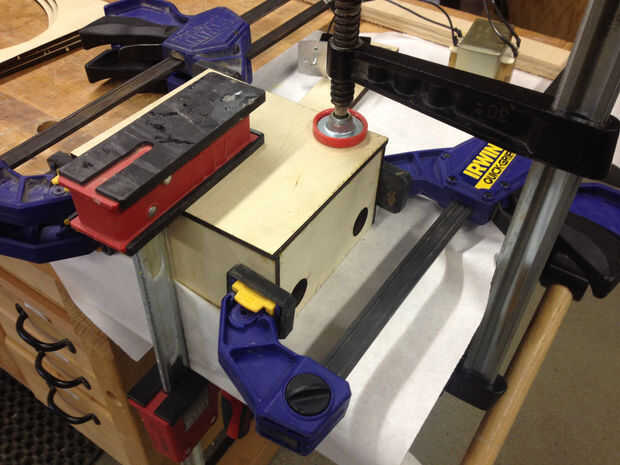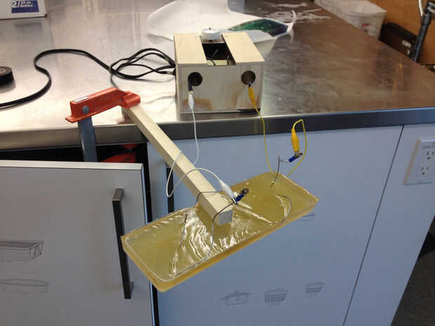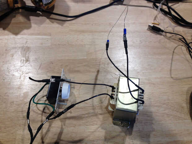 Soldar conectores a mi reostato y transformador por versatilidad: nunca sabes cuando puede volver a utilizar componentes electrónicos antiguos. He probado mi sistema en 12" pieza de 0,025" acero inoxidable, con buenos resultados. Aprendí no con alambre caliente que es más corto que aproximadamente 8" porque podría corta el circuito, y con este reóstato particular que necesita girar la perilla de un cuarto de vuelta para activar el voltaje, luego marcarlo hasta el ajuste deseado. Fui por el método de "sentir"--cuando el cable era demasiado caliente para mantener mi dedo sobre él para más de unos segundos, estaba en una buena temperatura. Láser de corte y pegado una caja para guardar mis repuestos asegurado y aislado.