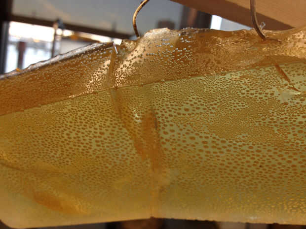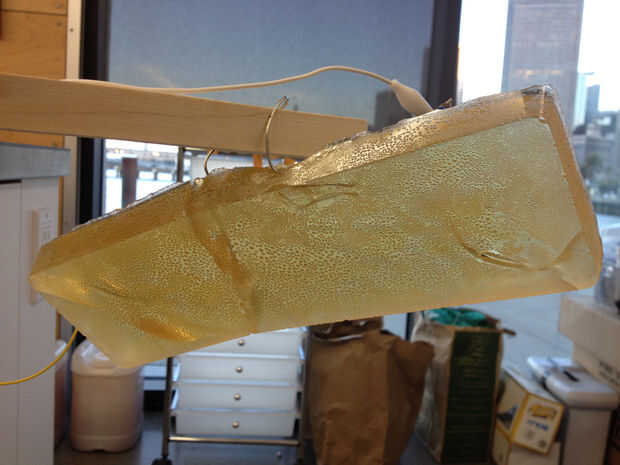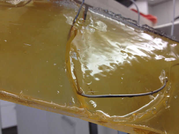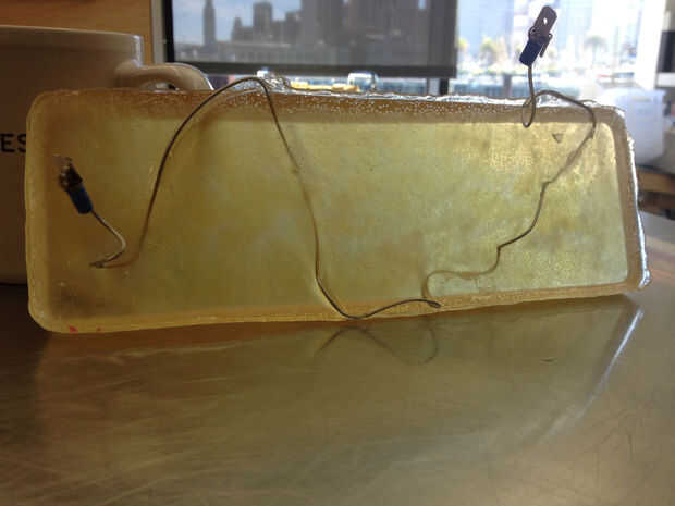 Para mi primer experimento, encaja el alambre de acero de calibre más grueso en un bloque de caramelo duro. Tejió el hilo dentro y fuera de la fundición por lo que podría suspender toda la pieza del alambre más adelante. Entonces todo enchufado y encendido por el calor. Al instante, mi pieza térmica dio una sacudida eléctrica. Pude oír crujidos y aparecer fracturas desde el interior del bastidor, justo por el hilo, a la superficie exterior más cercana. Aún así, el hilo caliente realmente ligado la pieza. Vi el caramelo comienza a caer y derretirse, lentamente separa el hilo que estaba sosteniendo. Cuando me podrian decir que caería en cualquier momento, dejé el experimento. Este fue un juicio más bien decepcionantes, a pesar del drama inicial. Parece que el reostato realmente impide la lenta acumulación inicial de calor. Para futuras iteraciones, no podré insertar alambre dentro de la fundición propia.