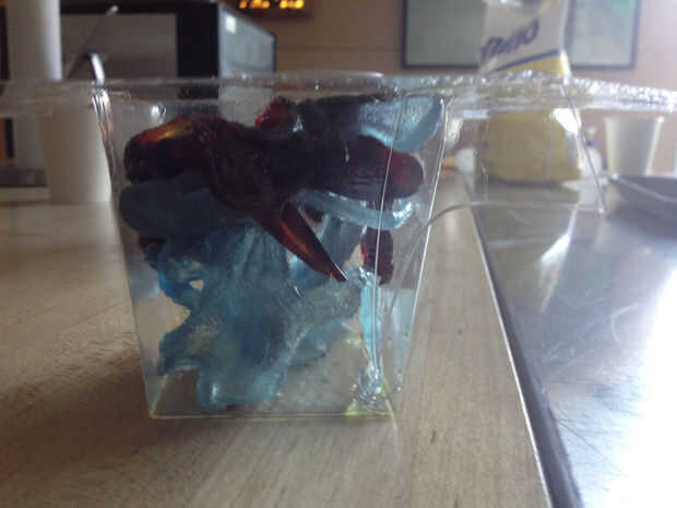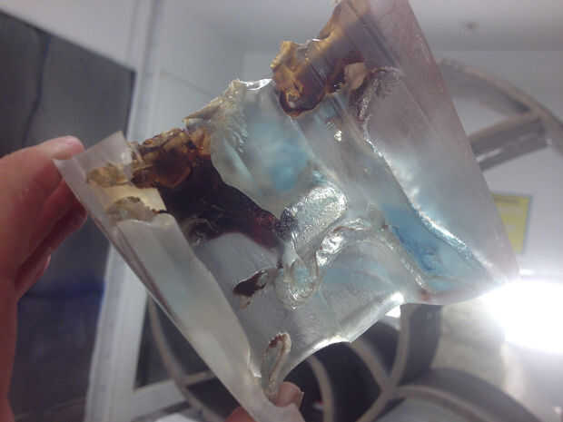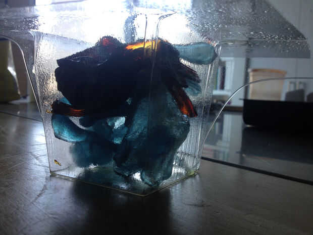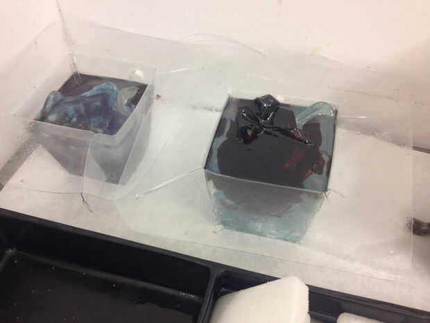 Para este ensayo, hice algunas piezas de luz azul y caramelizado azúcar, mano manipuladas les y coloca dentro de moldes formados vacío. Luego llené los moldes en la parte superior con resina epoxi transparente. Cuando la resina curada, corté cada molde en la mitad de nuestro cortador por chorro de agua con una línea curva orgánica. Esto resultó funcionar bastante bien: el agua erosionó ligeramente el azúcar, dejando interesantes ranuras y espacios negativos a lo largo de la longitud del corte en ambos lados. Había pulido las superficies exteriores después de moldear mis partes. Definitivamente usaría este método en piezas más grandes y más en el futuro, teniendo en cuenta que cuanto mayor sea el volumen de la resina, el más caliente se consigue y más probable es derrita el azúcar en formas indistinguibles. También, si el corte por chorro de agua era la mayor parte del azúcar lejos de erosionar, que así sea! El espacio negativo sería interesante por sí mismo, o ser llenado nuevamente otra vez la corte--tal vez incluso con otro material, como la cera.