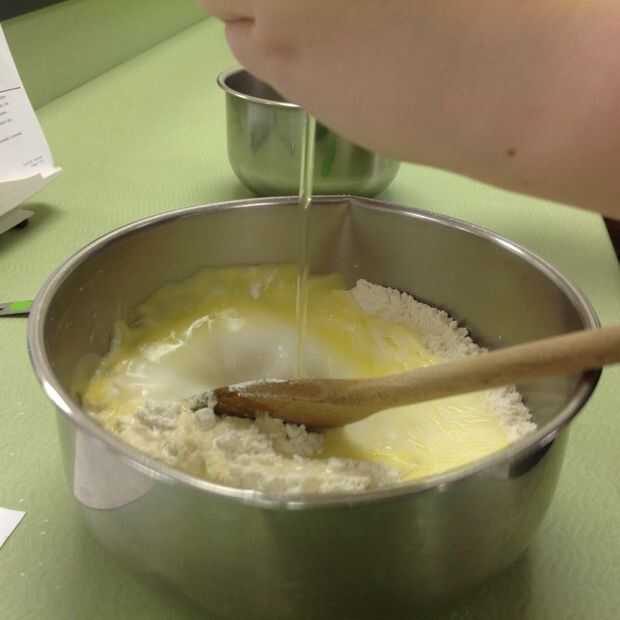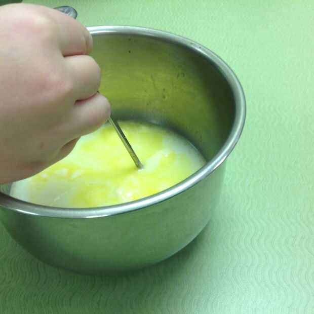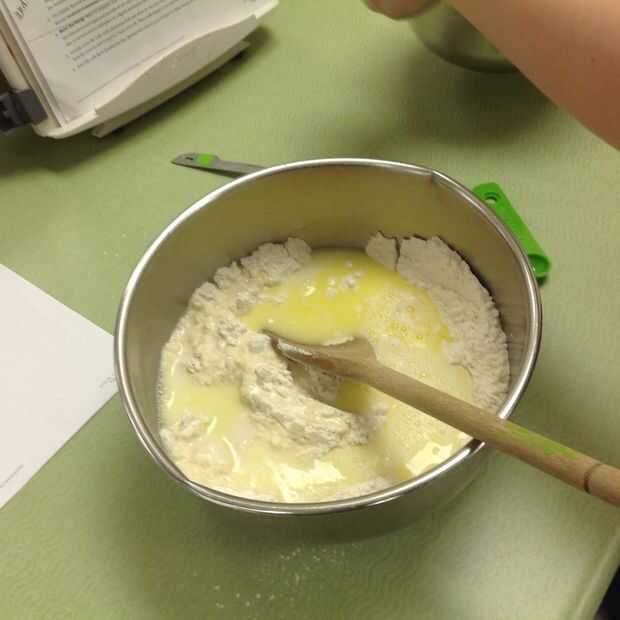 Calentar el agua, la leche y la mantequilla en el microondas hasta que la mantequilla se haya derretido y la mezcla esté caliente al tacto. Cerca de 115 ° F (46° C). Revuelva la mezcla de harina a la mezcla de mantequilla. Añadir el huevo y suficiente de la harina reservada para hacer una masa suave. Sólo necesitaba 1/3 de taza, pero usted puede necesitar el completa 1/2 taza. La masa estará lista cuando suavemente tira lejos del lado del tazón de fuente y tiene una consistencia elástica.