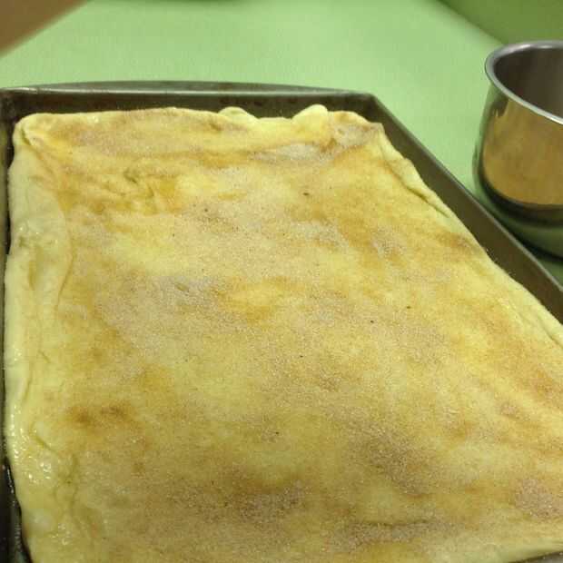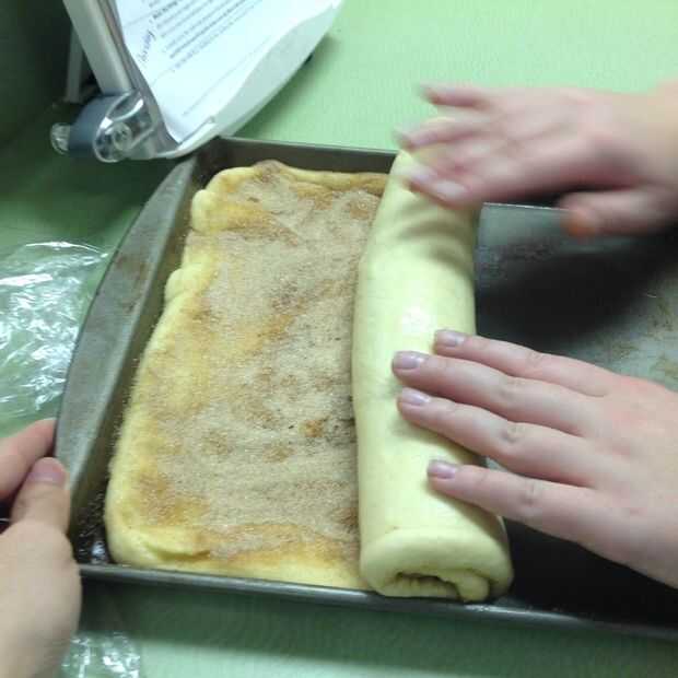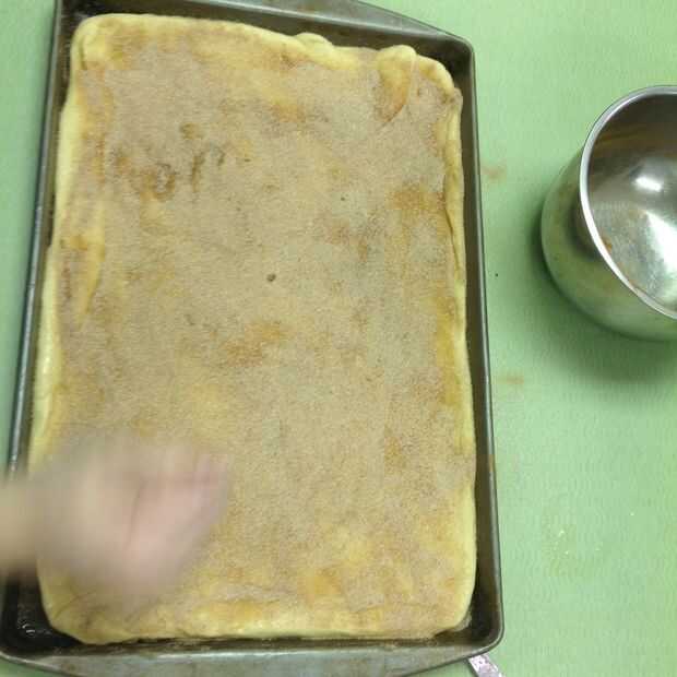 Después de 10 minutos, fuera el rodillo la masa en un rectángulo de 14 x 8 pulgadas. Extender la mantequilla en la parte superior. Mezclar la canela y el azúcar y espolvorear por toda la masa. Añadir más canela/azúcar. Enrolle firmemente la masa. Cortar en trozos hasta 11-12 y colocar en una cacerola redonda ligeramente engrasada de 9 pulgadas. He utilizado un plato de pastel, ligeramente rociado con spray antiadherente.
