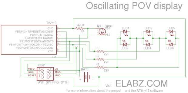 ¿A diferencia de muchos (la mayoría)? Pantallas POV ha llegado a través de nuestra pequeña pantalla POV tiene otra limitación porque ATtiny13 tiene sólo 5 líneas de entrada/salida (bueno, OK, tiene 6 pero la última de ellas se utiliza como Reset y si tomamos como una E/S, no podremos re-escribir el programa sin un programador de alto voltaje). Puesto que no podemos tener un LED por una salida y luz todos 6 los LEDs que hacen que una columna a la vez, necesitamos scan LED con el tiempo, es decir, la luz les uno por uno pero todavía tan rápidamente todos los 102 flashes ajuste dentro del plazo obligatorio de 50ms. Por esta razón tiempo llega a ser muy crítico en este proyecto y es muy importante utilizar los LED rojos más brillantes se pueden encontrar - sin duda ir a por 5000mcd + brillo - ya que cada LED tiene sólo 1/102 del tiempo marco brillar y registrar en su cerebro.