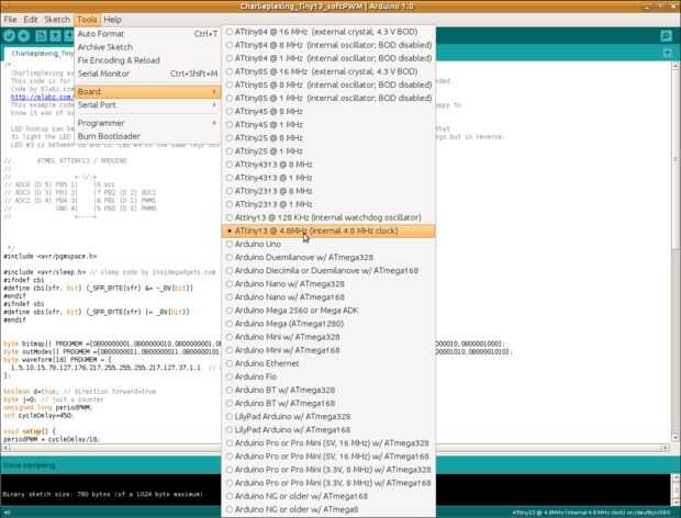 Sin soplar esta intructable particular de proporciones, baste decir que no necesita ningún software no-libre y que no sea una placa Arduino, no necesita mucho hardware adicional ya sea - algunos cables y tal vez un zócalo del IC extra de 8 pines o simplemente una placa sin soldadura para montar el ATtiny13 está programando. El objetivo final es asegurarse de ATtiny13 es uno de los tableros que surgen en el IDE de Arduino al abrir herramientas -> tabla (ver foto más abajo) antes de compilar el bosquejo con el programa (ver archivo ZIP a continuación). Luego que cargue el binario compilado en ATtiny utilizando una placa Arduino como un programador o un programador especializado del AVR si tienes uno.