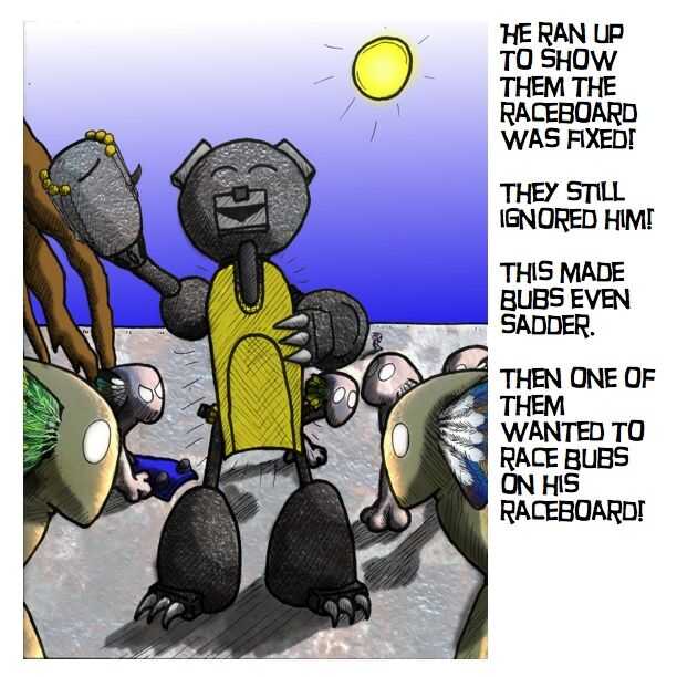 Hay una gran cantidad de señales emocionales en contacto con los ojos de la gente. Aquí el lil' chicos tienen sólo blanco círculos para los ojos por lo que no parece podrían transmitir una gran cantidad de información con sus ojos pero aquí atentamente están haciendo contacto con los ojos. De hecho, parece que puede haber un poco de tensión entre los participantes en el primero plano. Bubs rápidamente se convierte en el foco de esa tensión porque él no lo percibe.