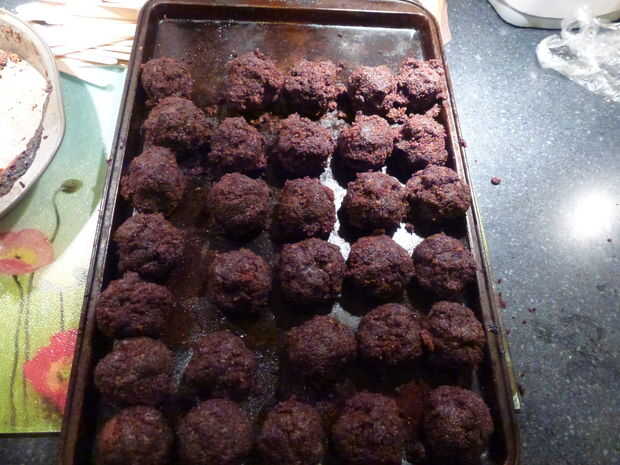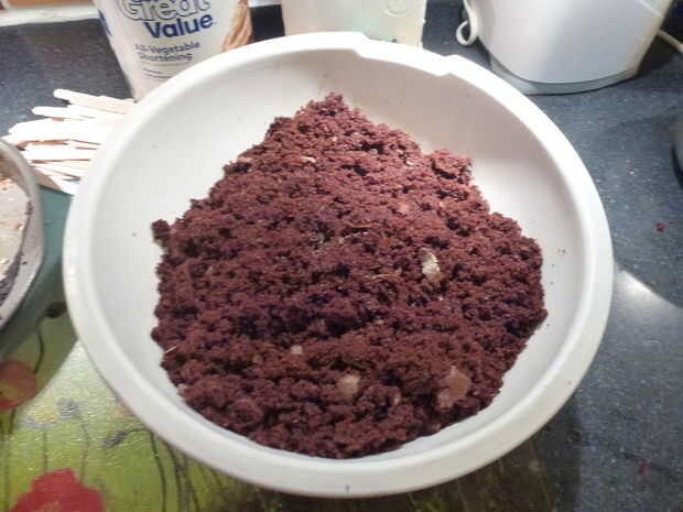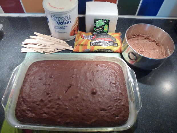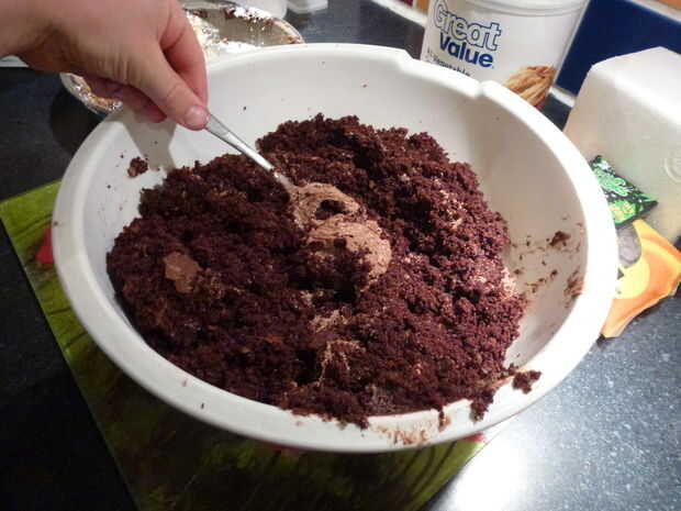 Primero, (ya sé que es triste) se desmoronan encima de tu pastel de chocolate frío y colocar las migajas en un recipiente. Mezcla en suficiente chocolate frosting para hacer la torta derrumba palillo juntos. Pop la mezcla en la nevera hasta que enfríe y firme.