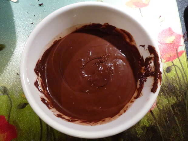En un bol apto para microondas derretir los candy melts o chispas de chocolate hasta que se derritan a una agradable consistencia. Si está utilizando chips de chocolate, añadir 3 cucharadas de Crisco.