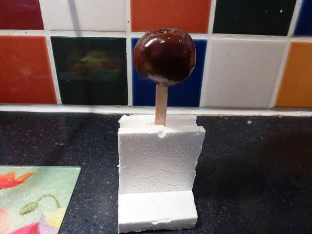 Sumergir las bolas de pastel en el chocolate derretido, que las cubre totalmente y sin problemas. Empuje los pops cake revestido en un bloque de espuma y dejan enfriar. Si el compartimiento del hecho anterior se llena de chocolate puede sacar hacia fuera con un palito. Deje que la concha de chocolate endurezca completamente antes de pasar a los siguientes pasos.