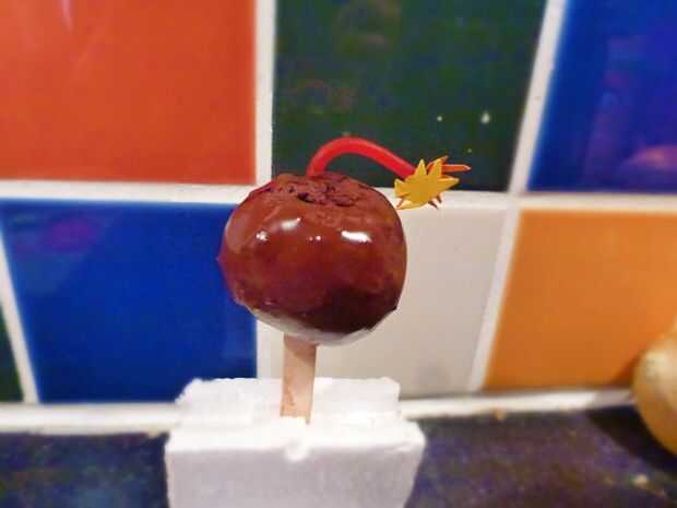Llene los compartimentos creados previamente en el cake pops con rocas Pop. NO no relleno los cake pops hasta dentro de 1 hora de servicio para las rocas Pop aparecerá al entrar en contacto con la humedad de la torta circundante. Por último, empujar una pequeña "cap" de algunos chocolate derretido o de mezcla de pastel en la parte superior del compartimento y parte superior de la torta pop con una longitud pequeña de regaliz o trenzado Fruit Roll-Up. Para imitar los ojos de un fusible de encendido, cortar estrellas de papel pequeño y sujete a la regaliz con chocolate derretido.