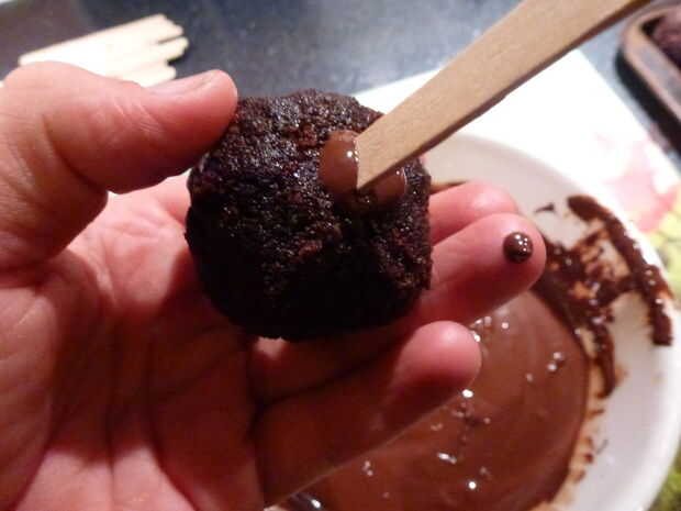 A continuación, sumergir unos centímetros de su paleta o palillos del Popsicle en el chocolate derretido y pegarlo en la parte inferior de las bolas de pastel. Deje que el chocolate se endurezca.