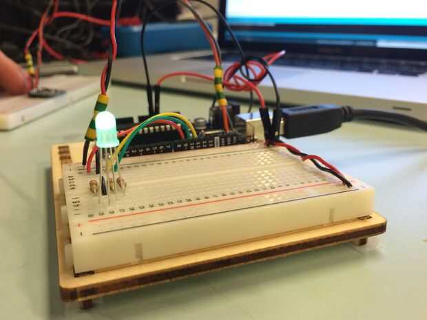 Además el cableado básico de la LSM303 a la arduino, necesita más cables, un protoboard, una resistencia y un LED RGB. La ilustración a la izquierda muestra cómo cablear todo. RGB rojo al pin digital 9 verde RGB para pin digital 10, azul RGB al pin digital 11 y de tierra a tierra.
