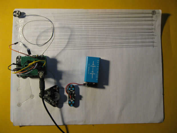 En un proyecto anterior he creado una tabla de prototipos para el circuito de Circuitscribe kit de construcción. Aquí lo lo uso con los tableros de desarrollador de Circuitscribe y un teclado sencillo DIY para explorar algunos conceptos de circuito de síntesis de sonido básico. Te voy a mostrar cómo crear un simple oscilador de audio con un chip de Hex Schmitt inversor 40106 y dos componentes adicionales en la placa de prototipos. Usaré tablero de luz intermitente de Circuitscribe para crear dos separado audio efectos - un oscilador de baja frecuencia y una puerta. Yo también te demuestran el uso de un potenciómetro para controlar el tono de la salida de los osciladores de audio y luego crearé un teclado de escalera simple resistencia DIY con tinta conductora.