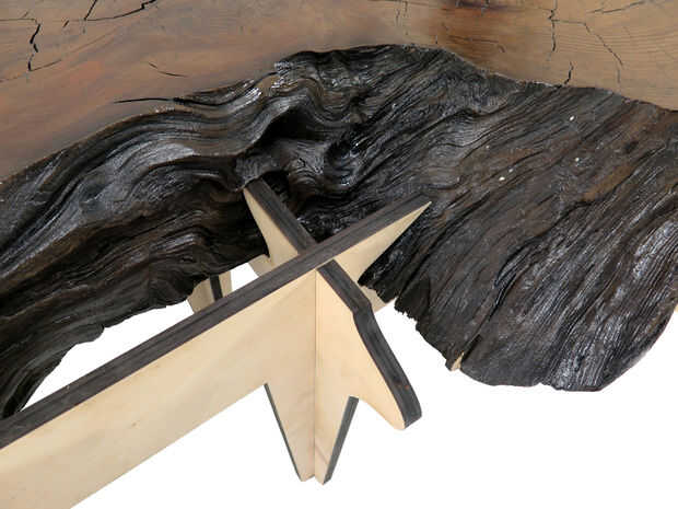 Mi compañero encontró este burl redwood hace unos años. Siempre he pensado que tenía una forma maravillosa, pero no fue en una condición. Ha estado viviendo en el porche en la parte superior una caja de madera recogida de telarañas, moho y putrefacción seca considerable. Pensé que tomaría el tiempo para restaurar el burl y llegar a una forma novedosa para hacer algunas las piernas. He estado fascinado con la suite de software de Autodesk 123D y su capacidad de digitalizar fácilmente objetos de modelado y fabricación. En este caso, usé 123D Catch para escanear y crear un modelo 3D del burl de redwood, Meshmixer editar y Rhino para producir las patas de la mesa que se envuelven alrededor de la superficie de la madera. Cortan las patas de madera contrachapada de 1/2" con un cortador del laser 500 vatios Metabeam.