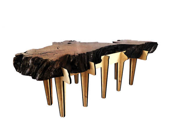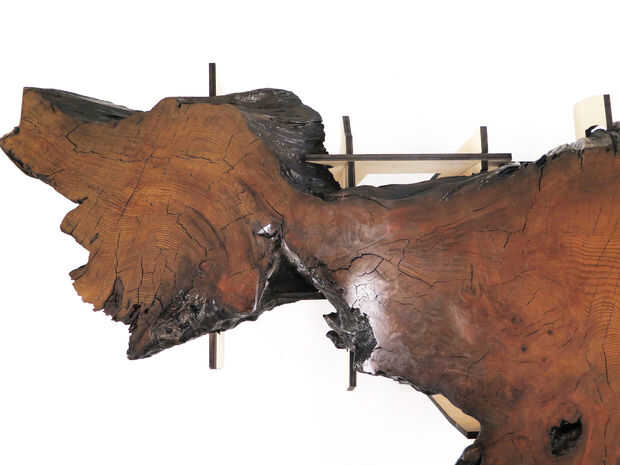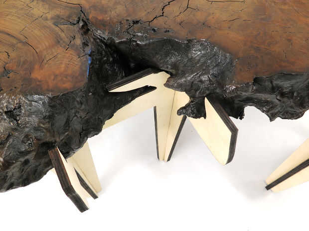 Después de ser reformado, el burl redwood tiene la dignidad de mostrando sus anillos de crecimiento y permanente en las piernas de su propia.