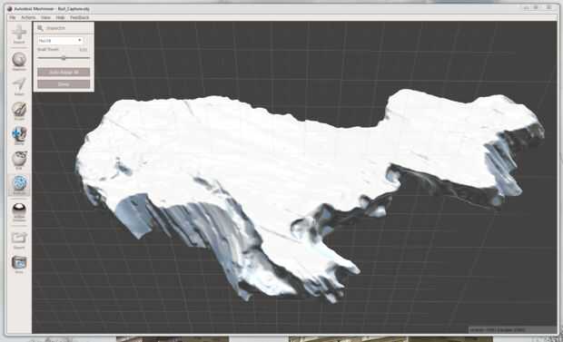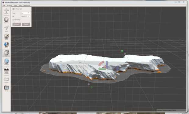Exporta el modelo 3D de 123D Catch como un archivo obj. Luego edité la geometría Meshmixer para limpiar y reparar el modelo. En primer lugar, solía cortar de plano rebanada el suelo lejos del burl de redwood y luego había eliminado geometría de fondo extraño que fue recogido en el análisis. Finalmente, reparado la geometría análisis > Inspector > Auto reparación todas. Este último paso es especialmente importante si usted planea su objeto escaneado de la impresión 3D. Elijo hacer esto para crear un modelo a escala y ver si mi proceso funcionaría.