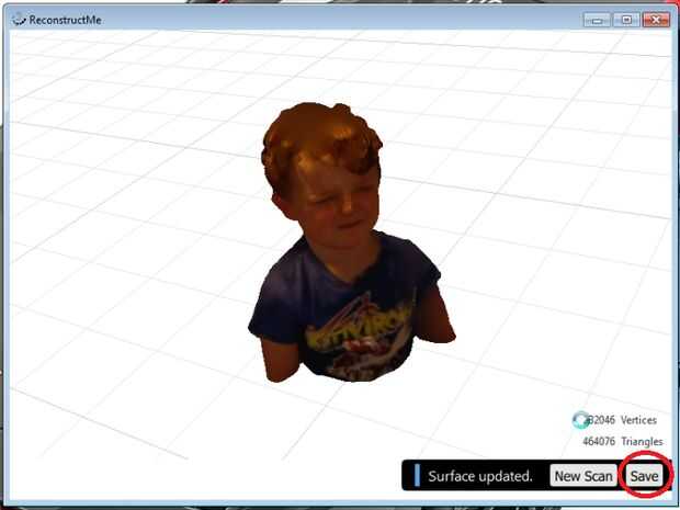 La versión gratuita de ReconstructMe afirma frenar el modelo de proceso de construcción hacia abajo intencionalmente y esta parte siguiente tomar un tiempo mientras. También añade un texto y esferas a su modelo al guardarlo. Solucionaremos esto en el siguiente paso con netfabb.