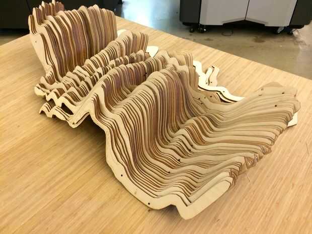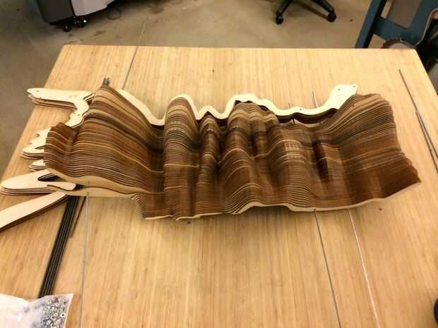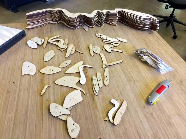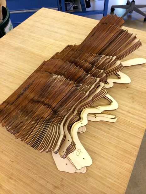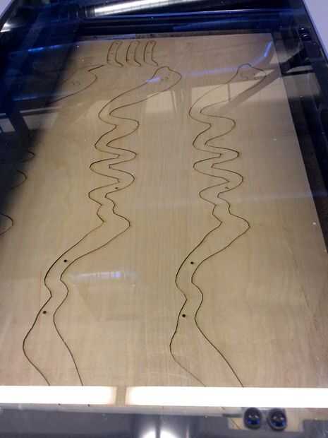 Siguiente que láser de corte todas las hojas de madera contrachapada. Esto tomó varias horas. La función de anidación en make 123D no anidarlas muy eficientemente para estas partes concretas por lo que cambiar los patrones generados automáticamente para ser más eficientes.